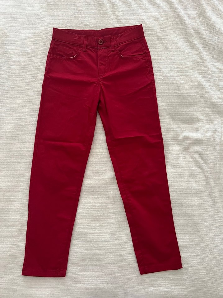 Bordo renkli, düz kesim erkek çocuk pantolonu, yumuşak sentetik kumaştan, sade ve canlı renkte, zahmetsiz şıklık sunar.