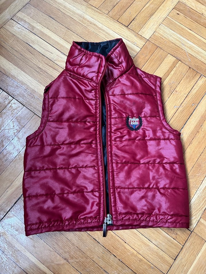 Bordo renkli, fermuarlı, yüksek yakalı ve ince kesim erkek çocuk yeleği. Yumuşak ve sıcak kumaştan, sokak stiline uygun. Hiçbir deformasyonu yoktur 1 yaş