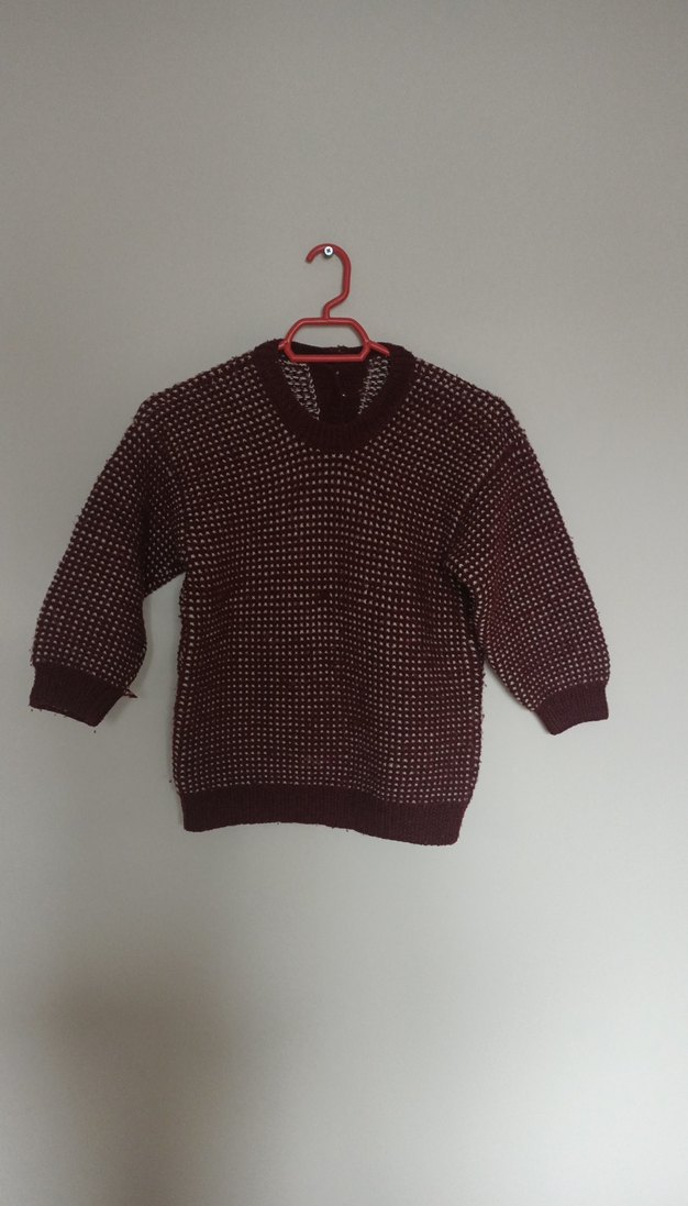 Bordo renkli, uzun kollu, yuvarlak yakalı örgü erkek çocuk triko kazak. Salaş kesimi ve sade deseniyle günlük sokak stiline uygundur.