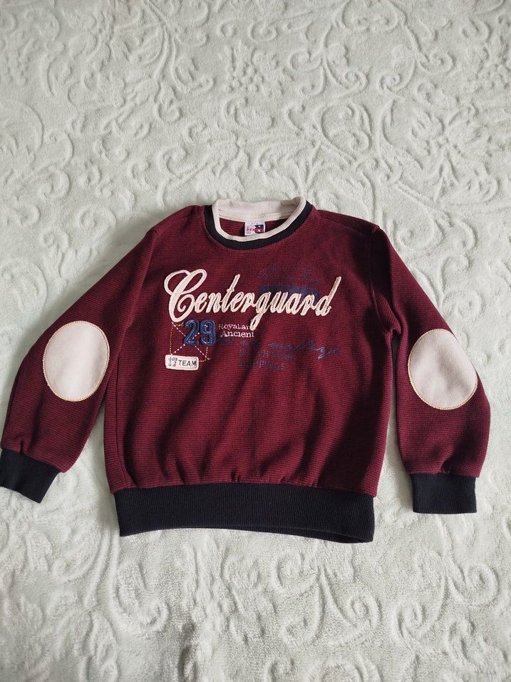 Bordo renkli, bisiklet yaka ve uzun kollu erkek çocuk sweatshirtü. Örme dirsek detayları ve baskılı desenlerle bol kesim, yumuşak ve sıcak kumaştan üretilmiştir.
