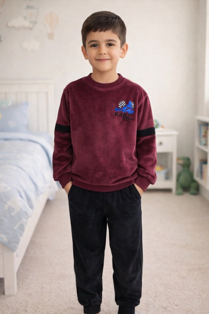 Bordo renkli, kadife yumuşaklığında sweatshirt ve siyah bol kesim eşofman altından oluşan rahat erkek çocuk takımı. 8 yaş