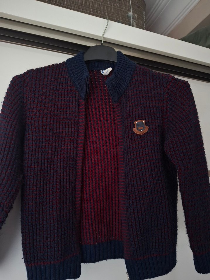 Bordo renkli, uzun kollu, fitted kesim erkek çocuk triko hırka. Düz ve normcore tarzda, küçük bir amblem detayına sahip.
