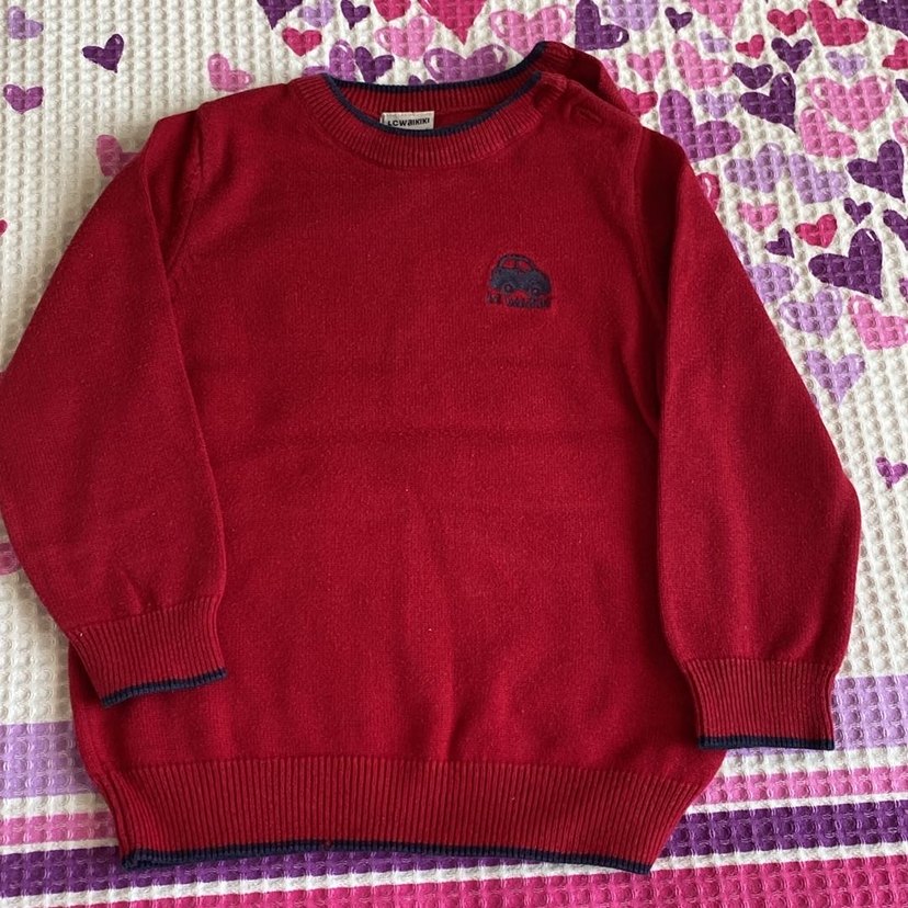 Bordo renkli, uzun kollu erkek çocuk triko kazak Yuvarlak yaka, bol kesim ve küçük araba işlemeli. Kullanılabilir makul durumda küçük deformeleri olabilir renk solması gibi