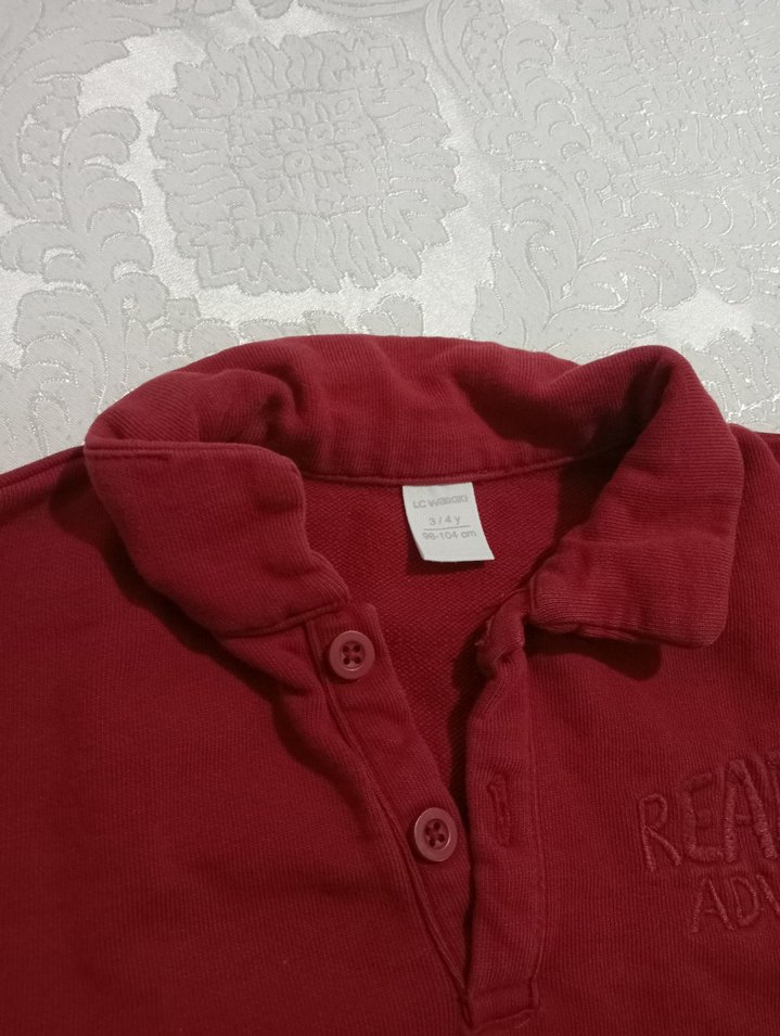 Bordo renkli, düğmeli ön ve yakalı erkek çocuk polo tişört. Uzun kollu, bol kesim, yumuşak ve sıcak kumaştan, sokak stili için uygundur. Düz ve desensiz.