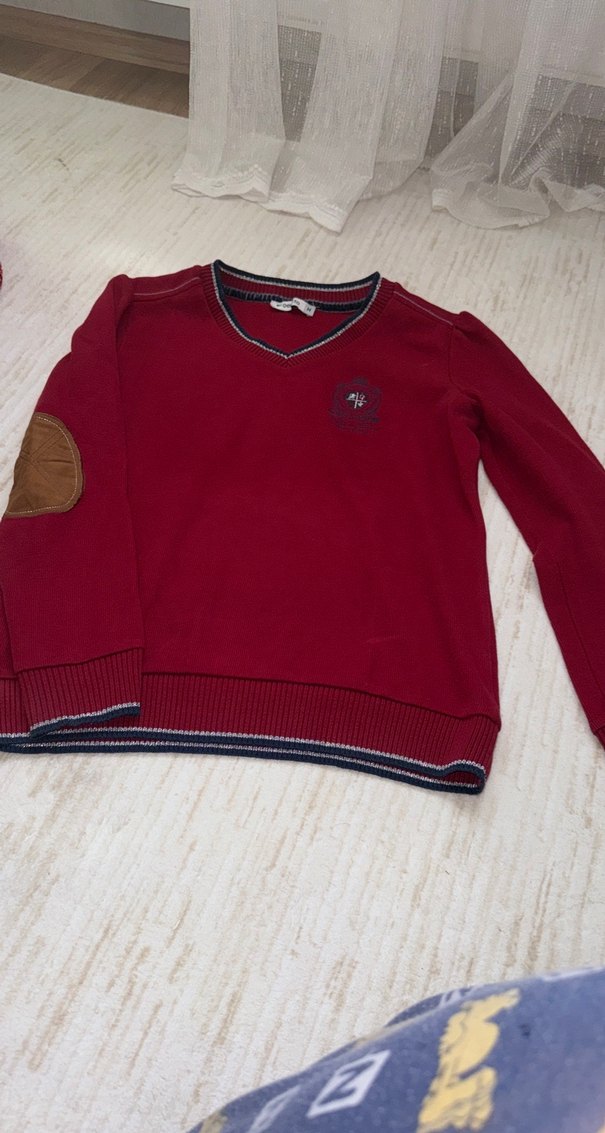 Bordo renkli, V yakalı ve uzun kollu erkek çocuk triko kazak. Yumuşak ve sıcak kumaştan, dirsek detaylı, trend sokak stiline uygun.