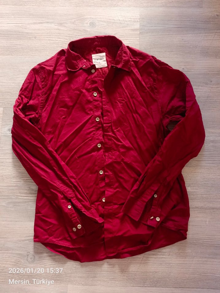 Bordo renkli, keten kumaştan yapılmış, uzun kollu ve düğmeli erkek gömleği. Regular fit kesimi ve yakalı tasarımıyla günlük sokak stiline uygundur. Düz ve midi boydadır.