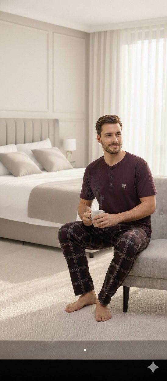 Bordo renkli, kısa kollu ve bisiklet yaka üstü ile kareli midi boy pantolondan oluşan erkek pijama takımı, rahat ve şık bir görünüm sunar.