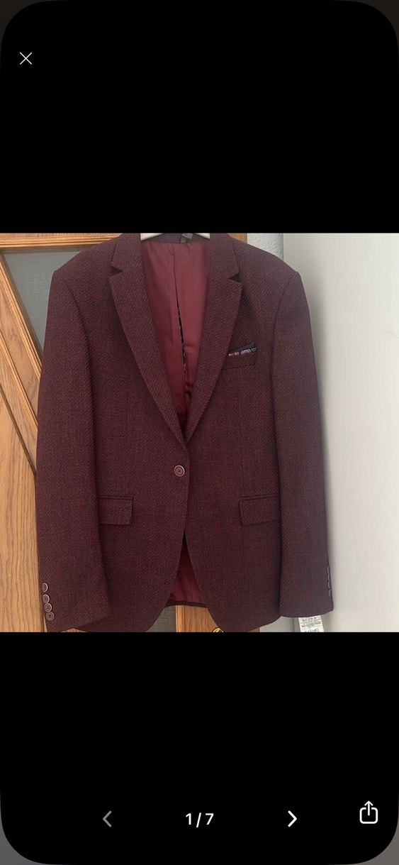 Bordo renkli, klasik kesim ve düğmeli erkek ceket. Uzun kollu, desen içermeyen bu model, ofis ortamı için modern klasik tarzda tasarlanmıştır.