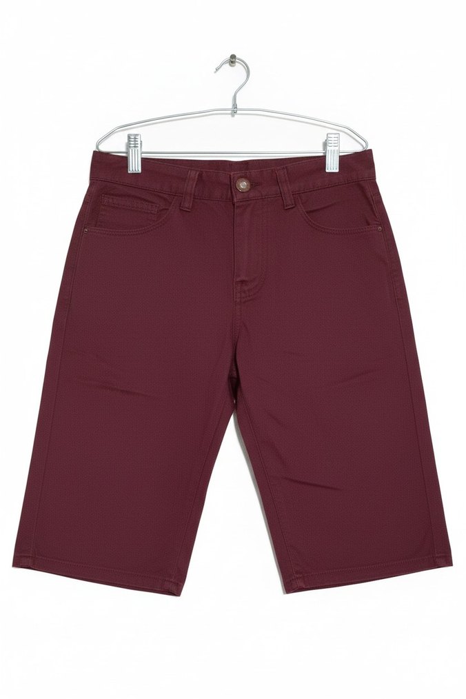 Bordo renk, midi boy, salaş kesim ve sentetik kumaştan üretilmiş erkek şort, rahat ve şık sokak stili için uygundur.