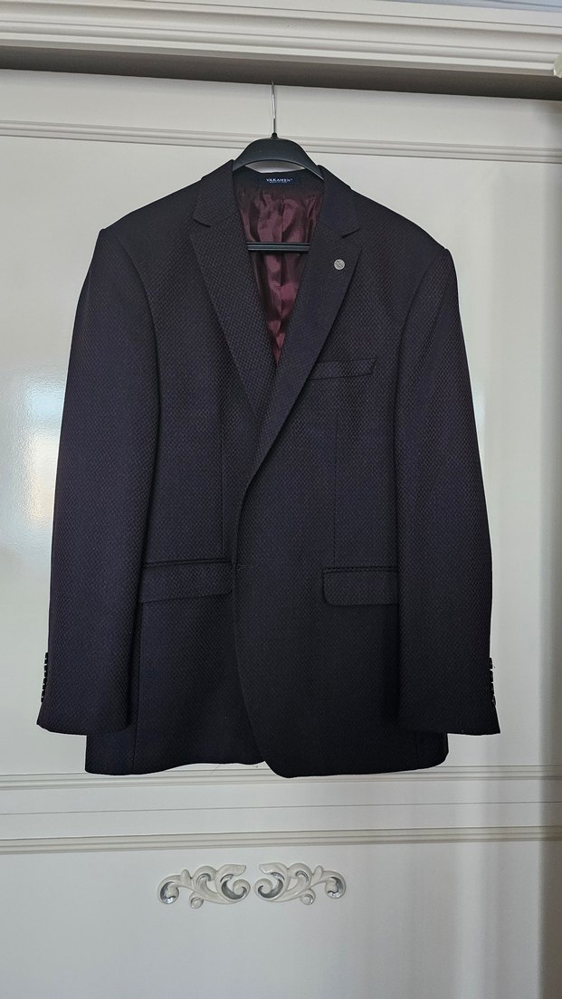 Bordo renkli, düğmeli erkek ofis ceketi. Normal boy, uzun kollu ve modern klasik tarzda, klasik şıklığı yansıtır. Desensiz ve klasik kesimdir.