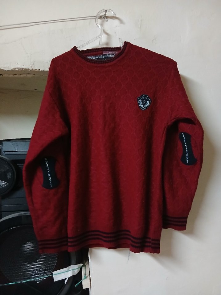 Bordo renkli, uzun kollu, yuvarlak yakalı erkek örgü sweatshirt. Rahat kesimi ve dirsek detaylarıyla sıcak ve şık bir görünüm sunar.