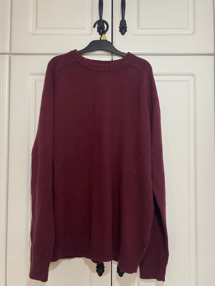 Bordo renkli, yün örgü erkek kazak, uzun kollu ve rahat kesimlidir. Günlük kullanım için uygun, sıcak ve şık bir tercih.