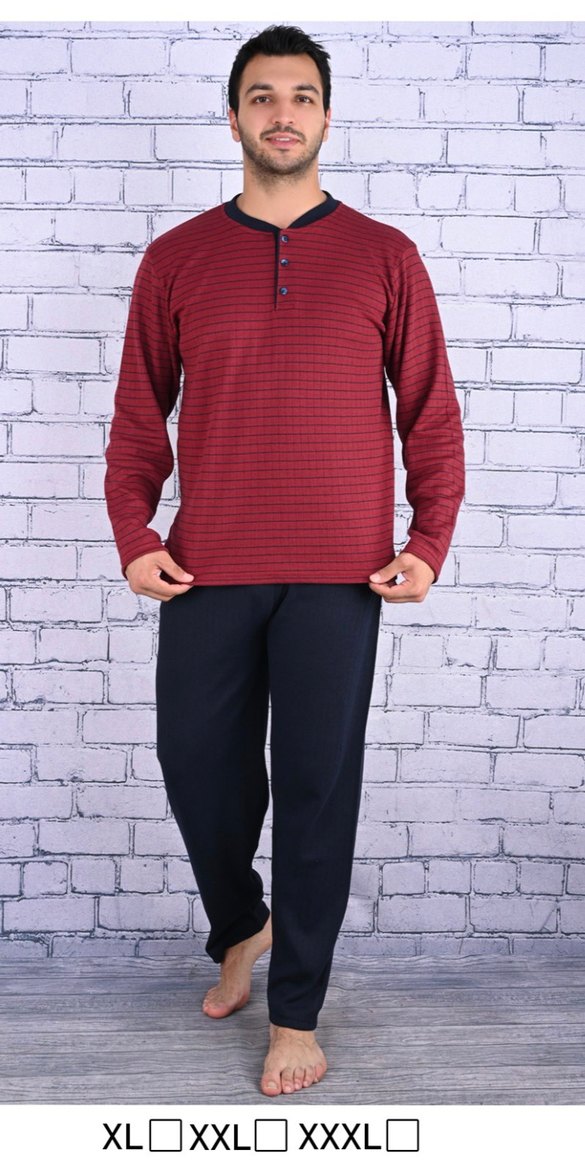 Bordo uzun kollu, bisiklet yaka ve ince çizgili üst ile koyu renk düz pantolondan oluşan, kemerli, regular fit erkek pijama takımı.