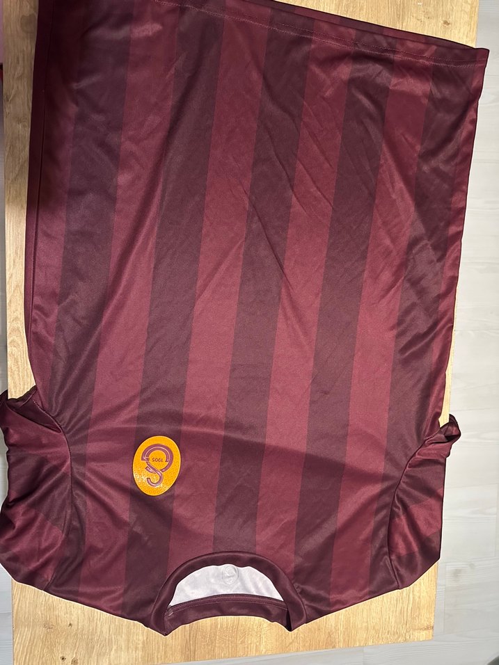 Bordo renk, kısa kollu, yuvarlak yaka, parlak sentetik kumaştan, baskılı ve bol kesim erkek spor tişörtü.