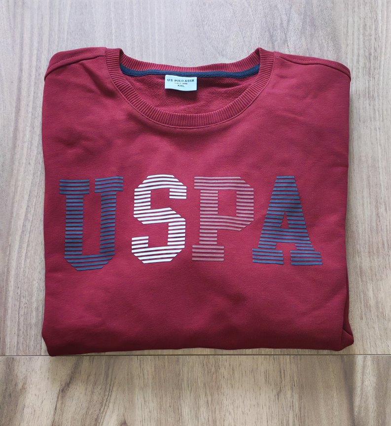 Bordo renkli, yuvarlak yakalı ve uzun kollu erkek sweatshirtü. Renkli USPA baskılı, bol kesim ve sokak modası tarzında.