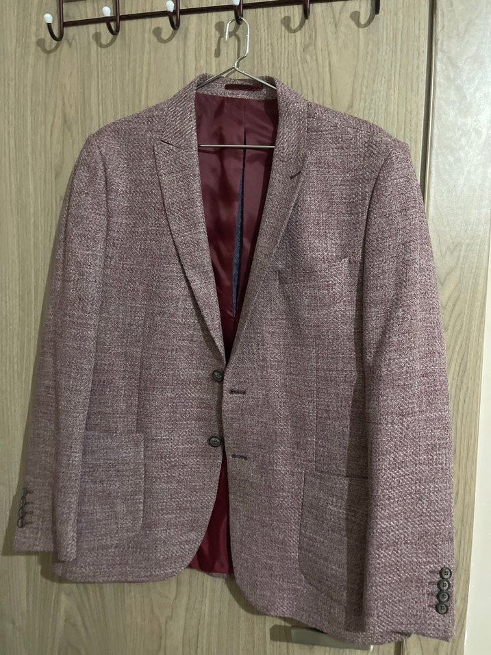 Bordo renk, slim fit, düğmeli ve uzun kollu erkek takım ceketi. Ofis için klasik ve çağdaş tarzda. Marka temsilidir.