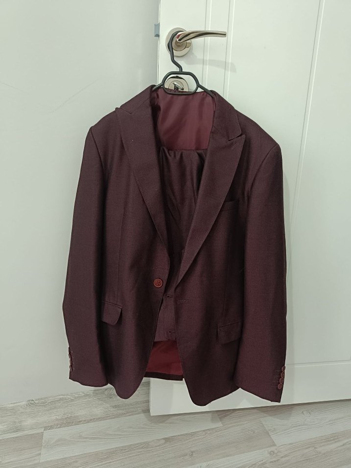 Bordo renkli erkek takım elbise, klasik kesim ve düğmeli ön kısmıyla dikkat çeker. Uzun kollu ve normal boyda, modern klasik tarzda iş ortamı için uygundur.