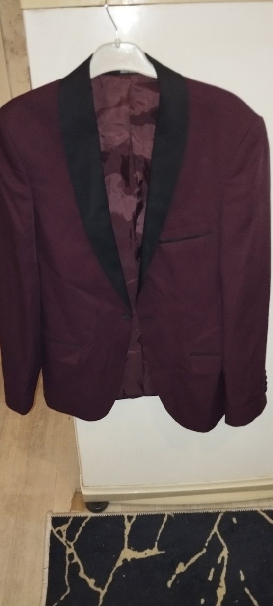Bordo renkli erkek takım elbisesi ceket, kesik yaka ve düğmeli ön tasarıma sahiptir. Normal uzunlukta, klasik ve çağdaş tarzda, iş ortamına uygundur.