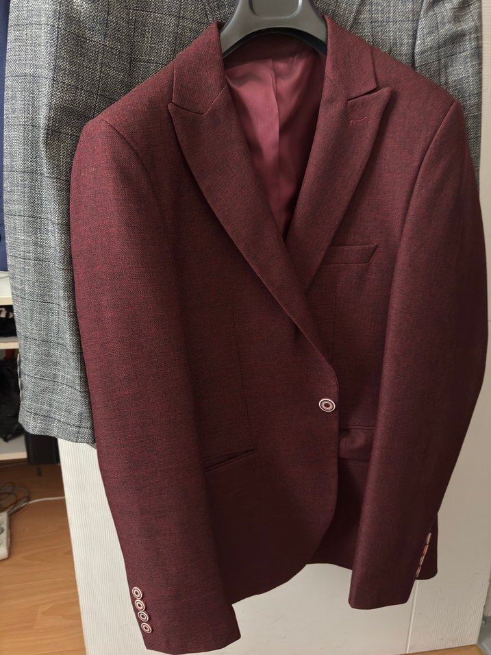 Bordo renkli, notch yaka, düğmeli ve uzun kollu erkek takım elbisesi. Normal boyda, klasik şıklık ve modern tarz sunar. İş ortamı için uygundur.