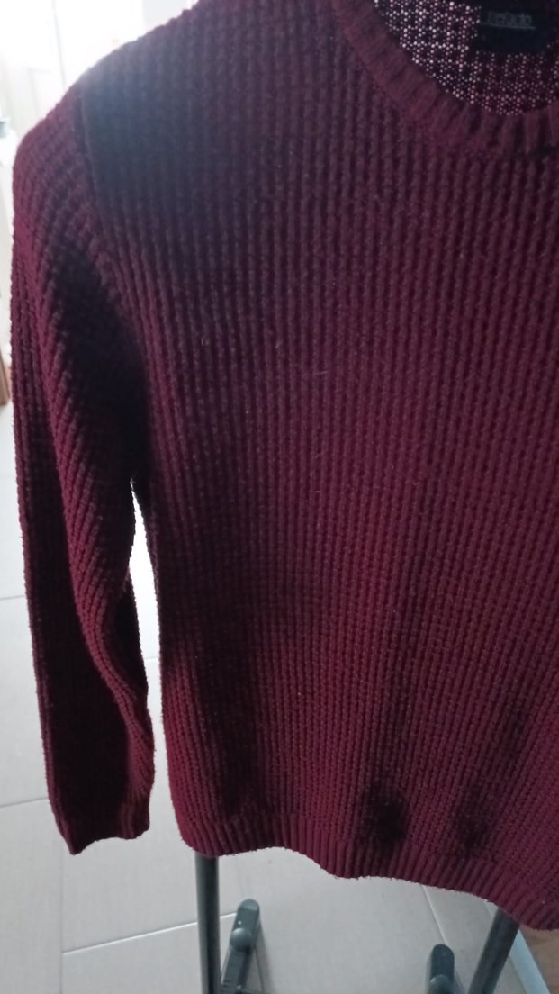 Bordo renkli, yuvarlak yakalı ve uzun kollu triko kazak, rahat ve günlük sokak stili için uygundur.