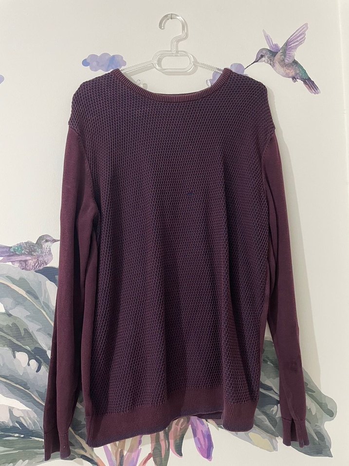 Bordo renkli erkek triko kazak, yuvarlak yaka ve uzun kolludur. Gevşek kesimli, normal midi uzunlukta ve sentetik kumaştan üretilmiştir. Minimalist sokak stili için uygundur.