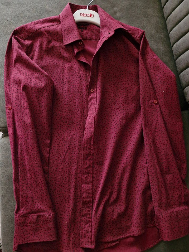 Bordo renkli, düğmeli ve yakalı uzun kollu erkek gömleği. Sentetik kumaştan üretilmiş, ofis ve günlük kullanıma uygun, modern kesim.S beden 1 kere giyilmiştir ve slim fit kalıptır defosu yoktur
