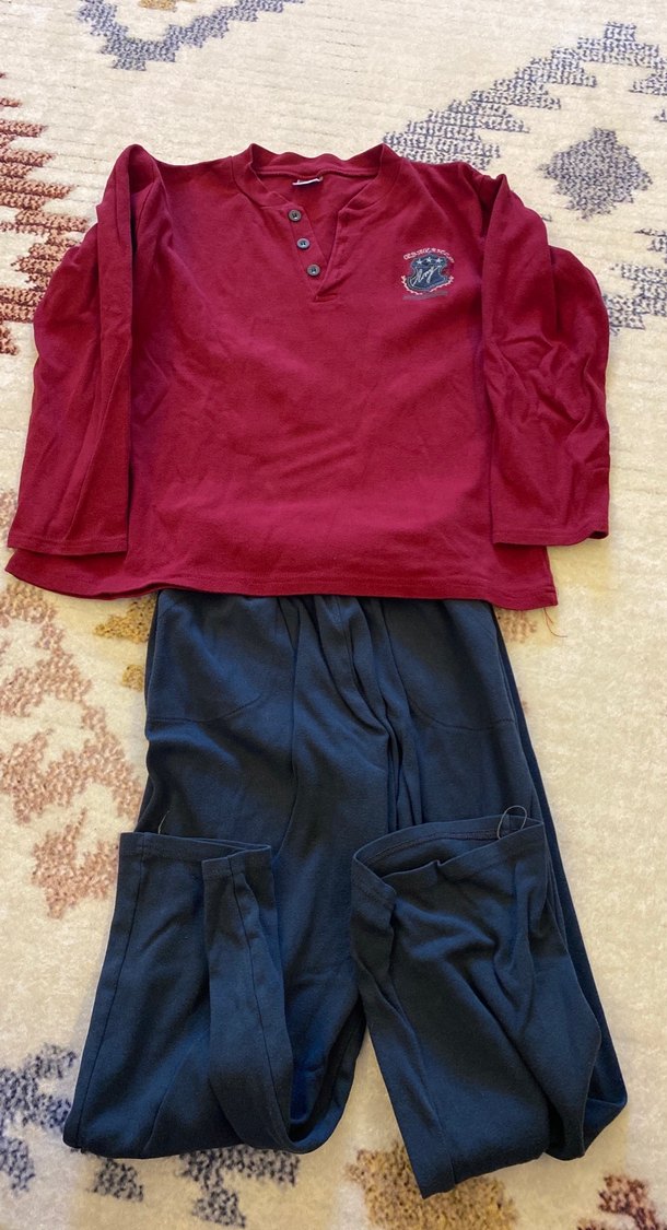 Bordo uzun kollu, yuvarlak yaka üst ve siyah midi boy rahat pantolonlardan oluşan erkek pijama takımı.