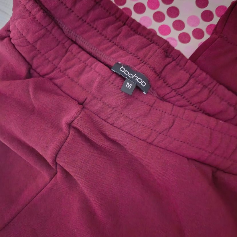 Yumuşak pamuk kumaştan, bordo renkte ve normal midi boyda bol kesim eşofman altı. Günlük rahat kullanım için uygundur.