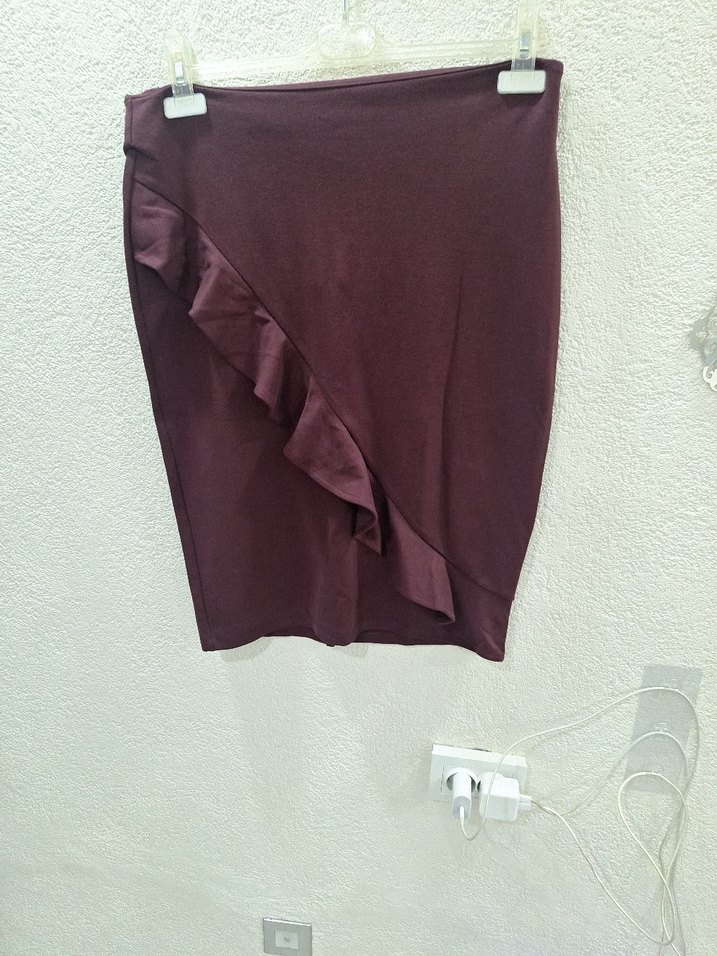 Bordo renkli, kısa ve vücudu sara eteği, önünde fırfır detayı bulunur. Düz ve şık tasarımıyla ofis stiline uygundur.