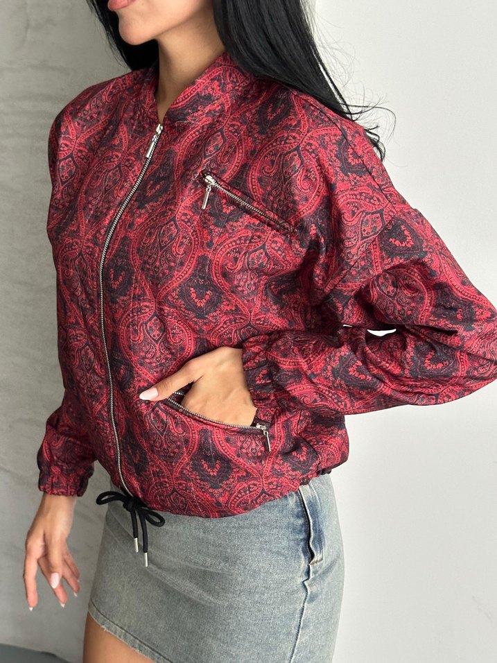 Bordo etnik desenli, sentetik kumaştan üretilmiş, bol kesim, uzun kollu ve yuvarlak yakalı kadın ceket. Fermuarlı cepler ve ön fermuar bulunur, günlük kullanıma uygundur.
