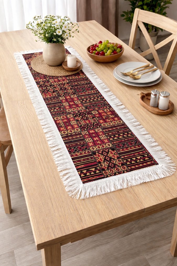 Krem püsküllü kenarları ve etnik desenleriyle bordo renk runner , masanıza geleneksel bir hava katar. ️