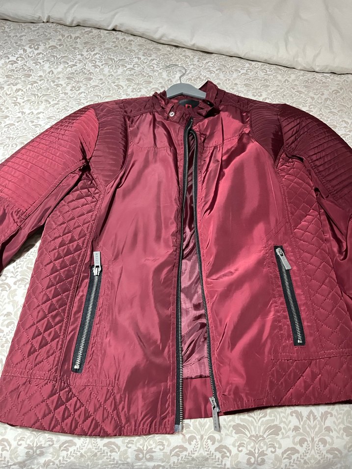Bordo, parlak sentetik kumaştan, fermuarlı cepli, kesimli ve normal boyda erkek ceket. Günlük şehir tarzına uygun.