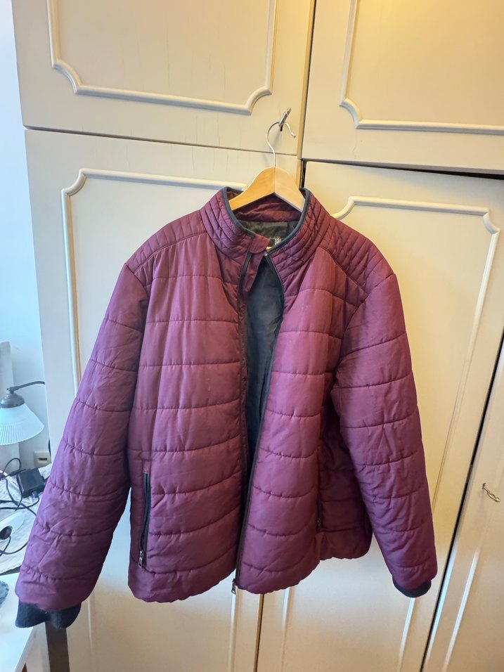 Bordo renkli, fermuarlı, uzun kollu ve notlu yakalı erkek mont . Rahat kesimi ve yumuşak, sıcak kumaşıyla günlük kullanıma uygun.