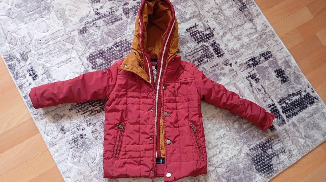 Bordo renkli, fermuarlı ve fitted kesim erkek çocuk montu, notched lapel yakaya ve fermuarlı ceplere sahiptir. Yumuşak, sıcak kumaştan üretilmiştir.