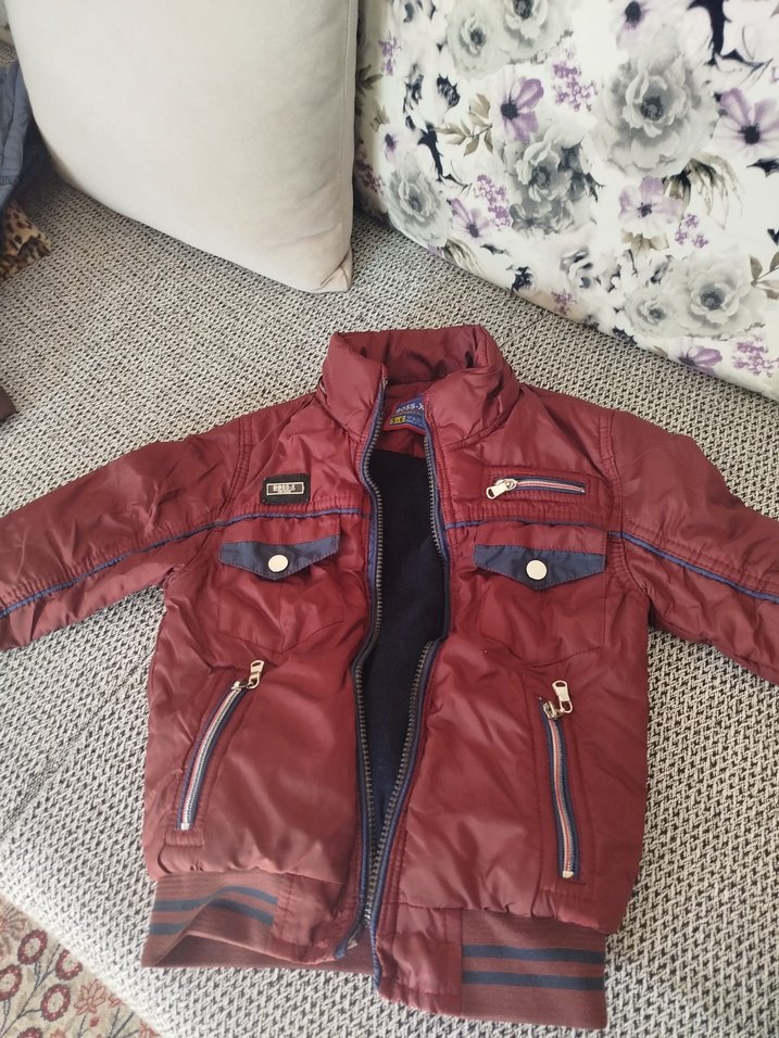 Bordo renkli, parlak sentetik kumaştan yapılmış, fermuarlı ve cepli erkek çocuk montu. Sokak stili için uygun, dar kesim ve yakası notalıdır.