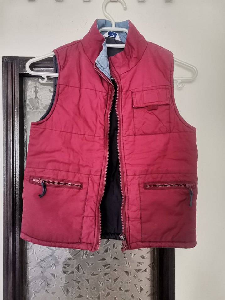 Bordo renkli, sentetik kumaştan yapılmış, fermuarlı ve yüksek yakalı, dar kesim erkek çocuk yelek. Sokak stili için uygun, kolsuz tasarım.