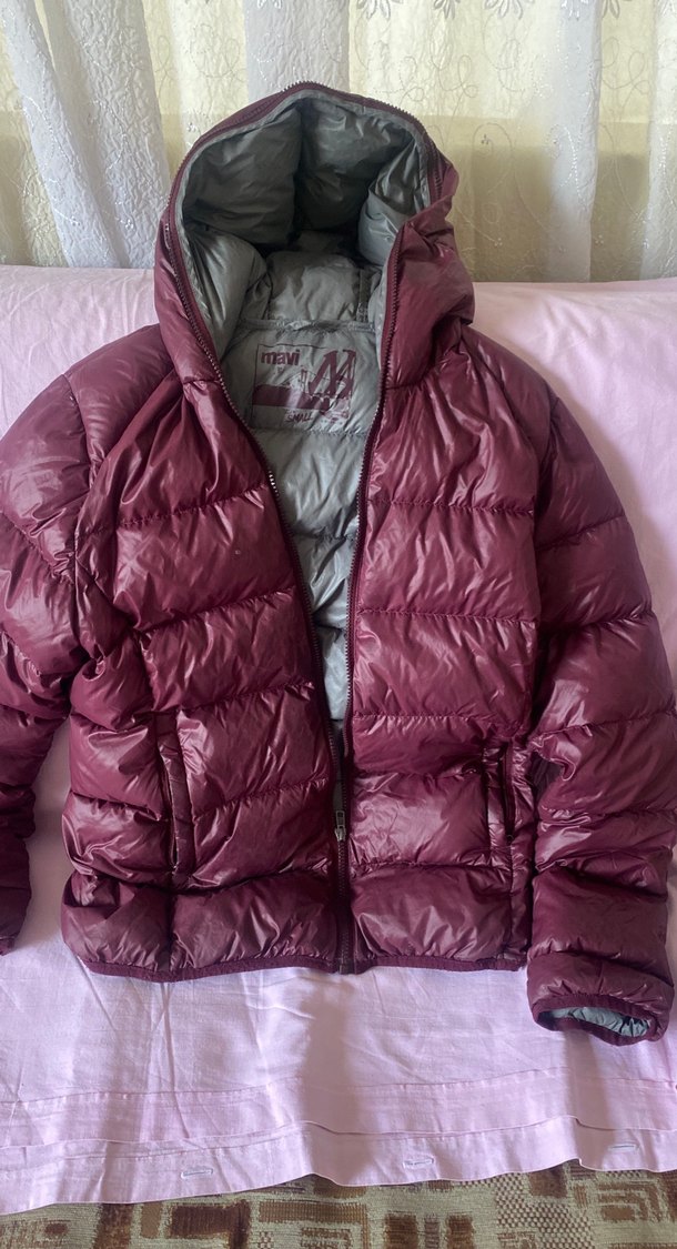 Bordo renkli, fermuarlı, yüksek yakalı #erkek kışlık mont. Sentetik kumaştan, uzun kollu ve midi boy. Trendy ve rahat sokak stili için uygun. ❄️