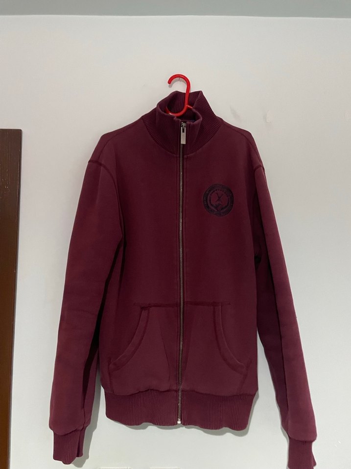 Bordo renkli, fermuarlı, bisiklet yaka ve uzun kollu erkek sweatshirttır. Sokak stili ve rahat kesimiyle günlük kullanıma uygundur.