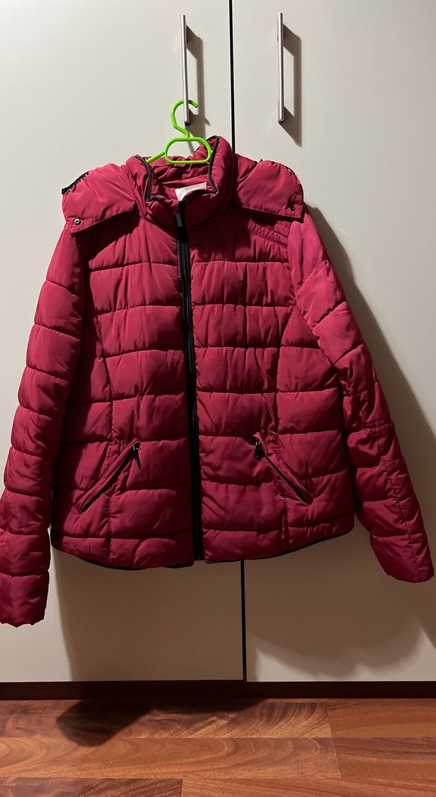 Bordo renkli, fermuarlı, normal boyda, dar kesim kadın kış montu. Notlu yaka ve cep fermuarlarıyla dış mekanlar için uygundur. ❄️