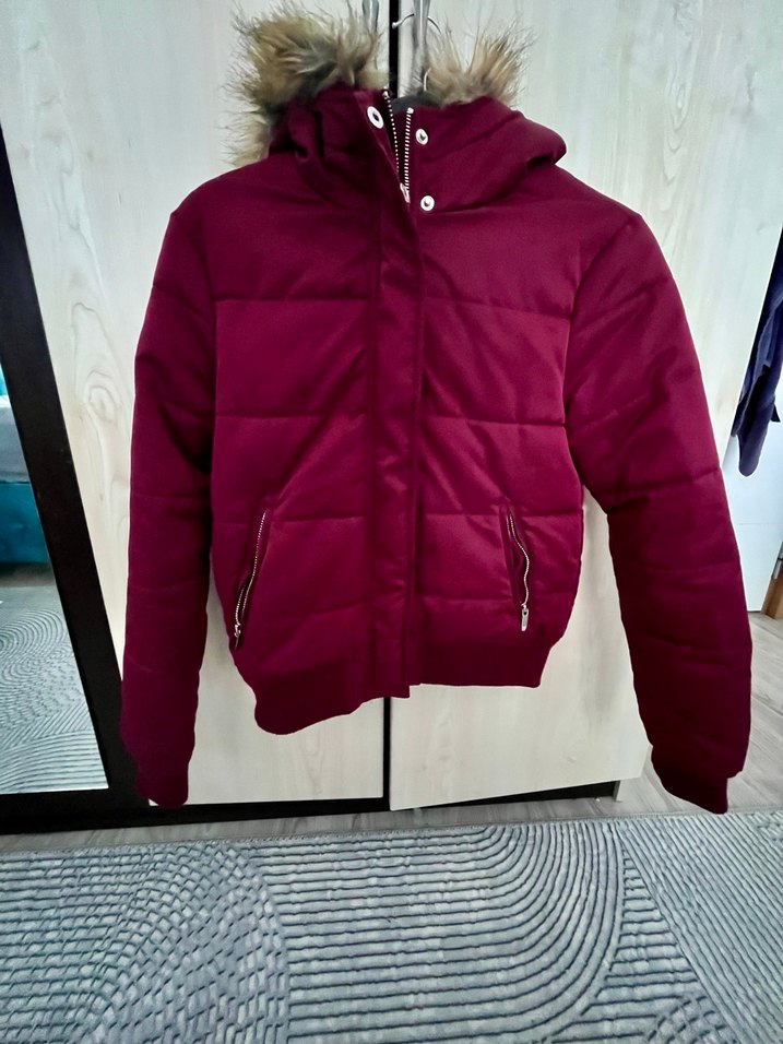 Bordo renkli, fermuarlı ve uzun kollu kadın kışlık ceket. Yumuşak fleece kumaştan, kürklü kapüşonlu ve notched lapel yakalıdır. Midi boy ve rahat sokak stiliyle dış mekan için uygundur. ❄️