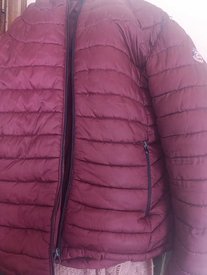 Bordo renkli, fermuarlı erkek kışlık ceket. Sentetik kumaştan, normal uzunlukta ve fit kesim. Notlu yaka ve askılı kollu, rahat ve şık sokak stili için uygun. ❄️