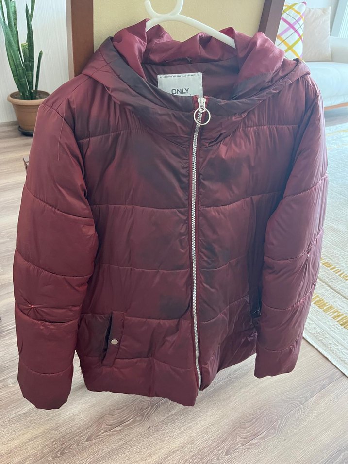 Bordo parlak renkte, fermuarlı ve kesimli kadın kışlık mont. Yumuşak ve sıcak kumaştan, trend sokak tarzına uygun. ❄️