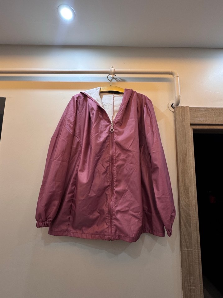 Bordo renkli kadın ceket, yüksek yakalı, uzun kollu ve fermuarlı. Gevşek kesim, parlak ve desensiz, midi uzunluğunda, günlük kullanıma uygun. İnce bi yapıya sahip yürüyüşlerde rahat hareket edilmesi için kullanılabilir