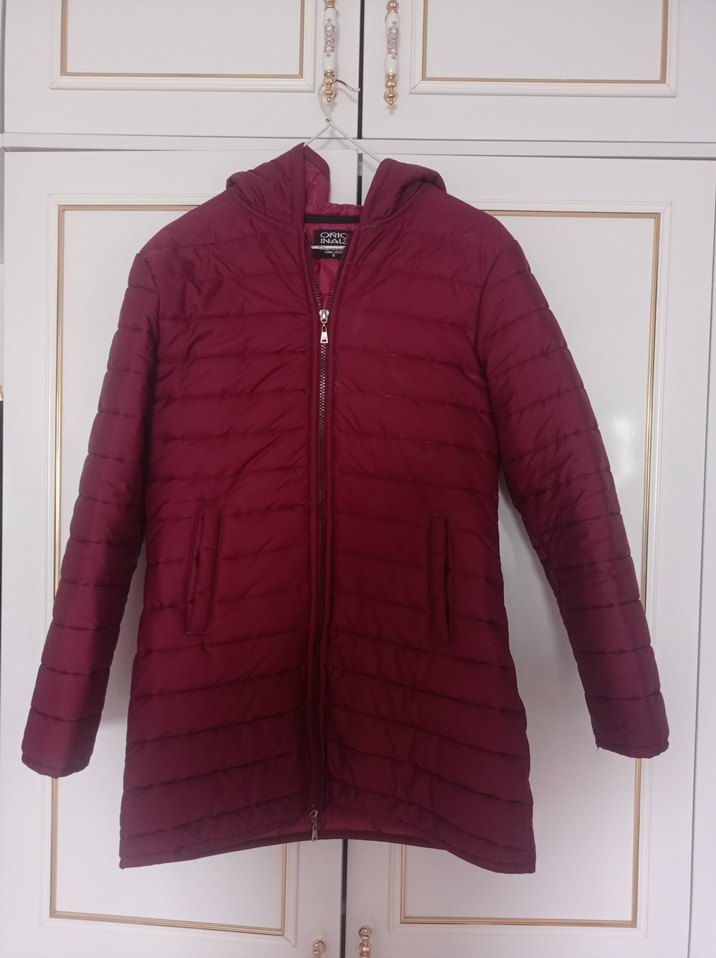 Bordo renkli, fermuarlı ve fitted kesim kadın kışlık şişme mont. Yumuşak ve sıcak kumaştan, notched lapel yakalı ve uzun kollu, rahat sokak stili için uygun. ❄️