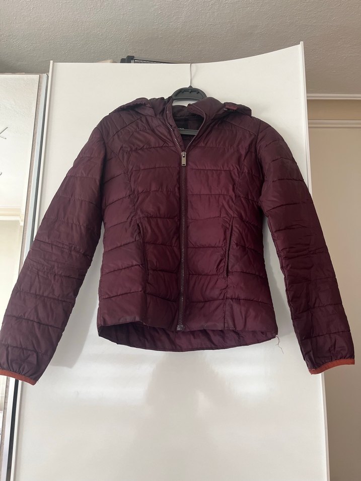Bordo renkli, fermuarlı ve uzun kollu bu kadın mont, notched lapel yakaya sahiptir. Yumuşak sentetik kumaştan üretilmiş, midi boy ve günlük kullanıma uygundur.
