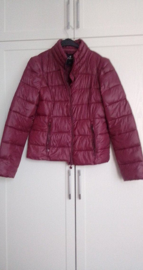 Fermuarlı önü ve kesik yaka detayı olan bordo renkli, kalıplı kadın mont. Yumuşak sentetik kumaştan, midi boyda, sokak tarzı için uygun.