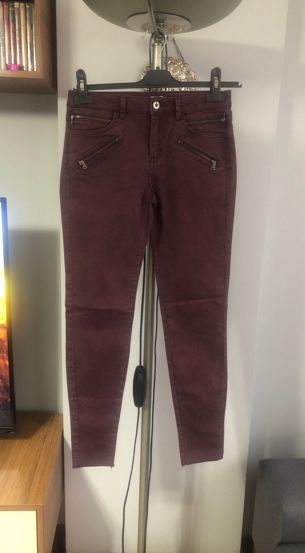Fermuarlı cepleri ve midi boyu ile bordo kumaştan, dar kesim kadın pantolon. Günlük sokak stiline uygun, koyu renkte sade tasarım.