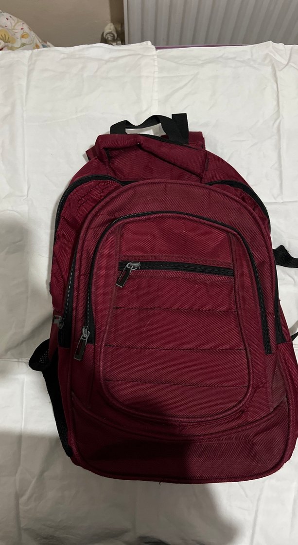 Bordo renkli, fermuarlı çok bölmeli, dayanıklı sentetik kumaştan yapılmış günlük kullanıma uygun minimalist tarzda kadın sırt çantası.