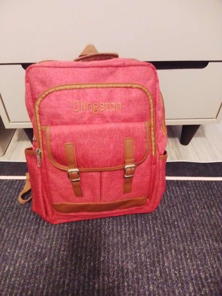 Bordo renkli, fermuarlı ve sentetik kumaştan yapılmış kadın sırt çantası. Parlak görünümlü, baskılı desene sahip ve "Chngston" logosu bulunur.