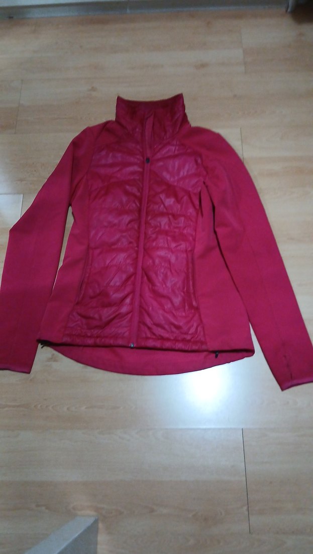 Bordo renkte, fermuarlı ve yüksek yakalı, uzun kollu, vücuda oturan kadın spor ceketi. Yumuşak ve sıcak kumaştan yapılmıştır, dış mekan kullanımı için uygundur.